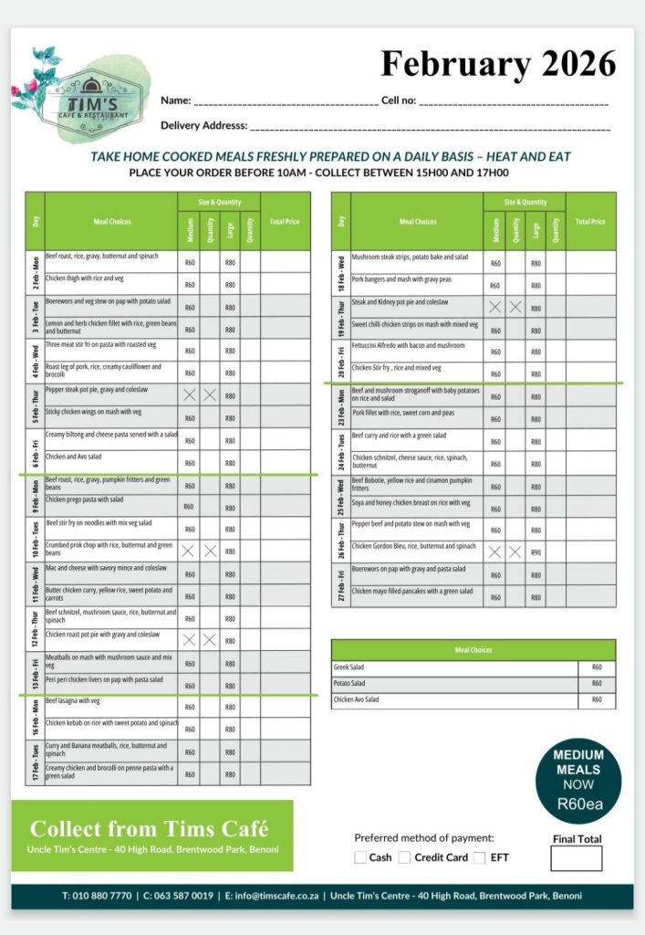 Craving the comfort of a home-cooked meal without the hassle of cooking? Tim’s Café & Restaurant offers freshly prepared, wholesome meals every day. Whether you’re in the mood for something savory or a dish that reminds you of home, our “Heat and Eat” meals are the perfect solution.